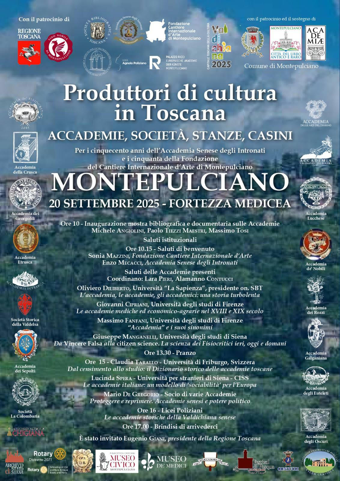 Evento estremamente ricco di spunti sotto il profilo culturale e umano quello tenutosi il 20 settembre presso la Fortezza Medicea di Montepulciano in occasione della giornata di studi «PRODUTTORI DI STUDIO IN TOSCANA. Accademie, Società, Stanze, Casini» accompagnata da una mostra bibliografica e documentaria dedicata alle Accademie storiche della Toscana, iniziativa promossa tra gli altri … Leggi ancora